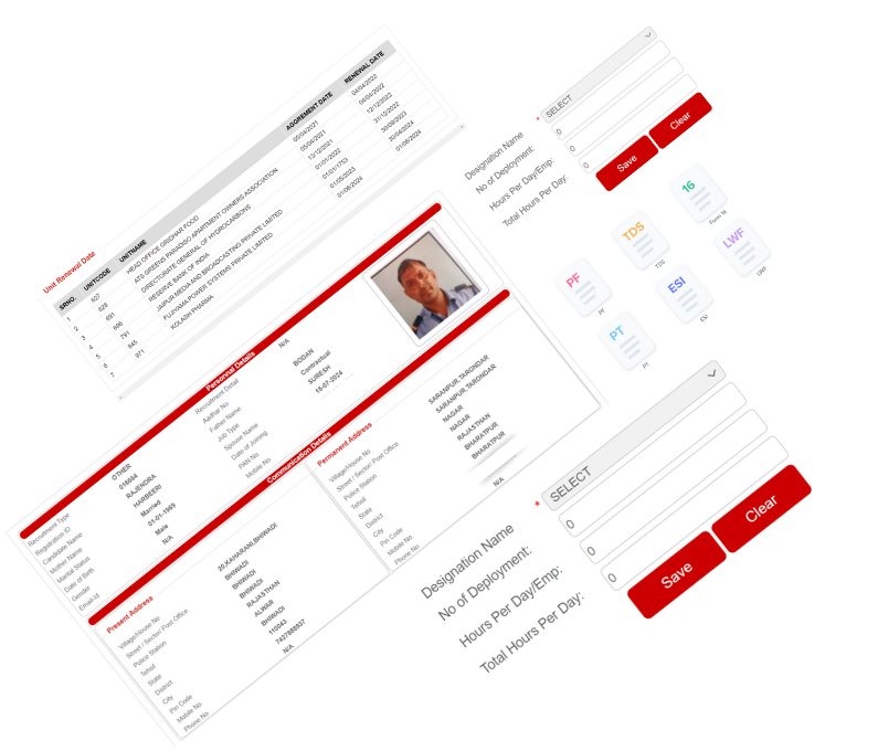 Import employee data easily and manage comprehensive records, including guard activities, face attendance, and live location tracking. Our software automatically handles PF, ESI, and LWF calculation, and manages uniform stock, loans, and advances with ease.